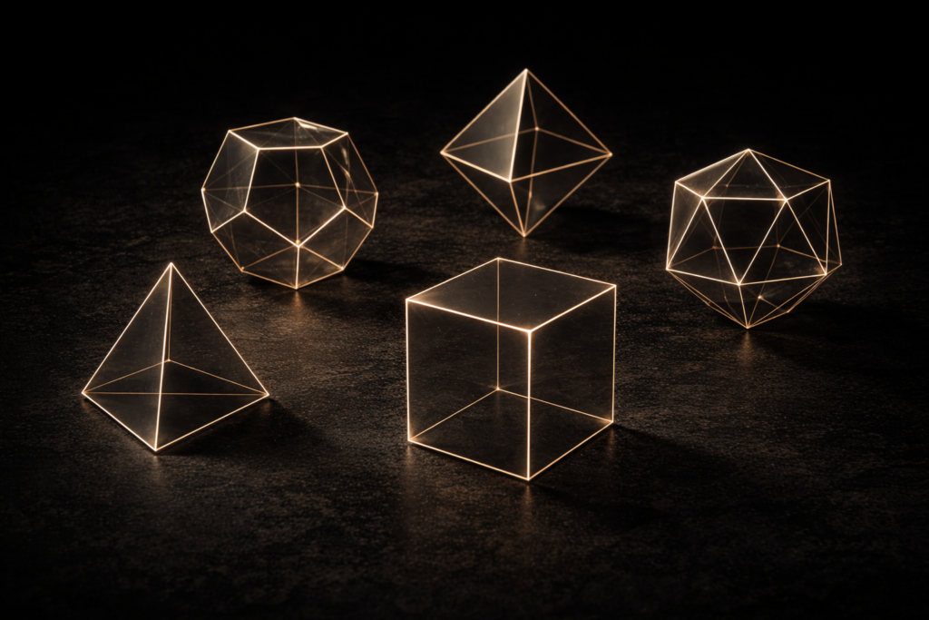 Plato, in the Timaeus, assigned each solid to an element. The tetrahedron to fire; sharpest, most penetrating. The cube to earth; stable, orthogonal, immovable. The octahedron to air. The icosahedron to water. The dodecahedron, with its twelve pentagonal faces, he assigned to the cosmos itself: the shape the demiurge used to arrange the constellations. Five forms, five principles, all of nature accounted for.