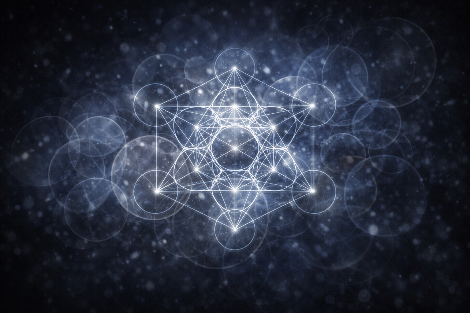 It begins with the Flower of Life, itself derived from the simplest possible act: one circle, then another centered on its edge, then another, until the overlapping rings produce a lattice of vesica piscis, the almond-shaped intersections that early Christian and Neoplatonic thinkers treated as thresholds between worlds. From the Flower, thirteen circles are extracted. Their centers are connected. Every center to every other center. The result is Metatron’s Cube: a figure of extraordinary density, which, when examined with patience, contains within its lines every Platonic solid, tetrahedron, cube, octahedron, dodecahedron, icosahedron, the five perfect forms Plato identified as the building blocks of reality.