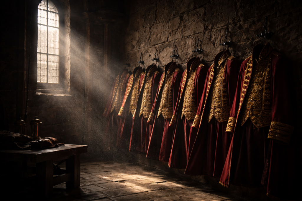 This is what Wittgenstein might have called a form of life, not a statement about loyalty, but loyalty enacted, renewed each morning at the wardrobe. The act of dressing was, in this sense, a liturgical act. You put on your lord’s colors the way a monk put on his habit: not to remind yourself of what you believed, but because belief, without embodiment, dissolves.