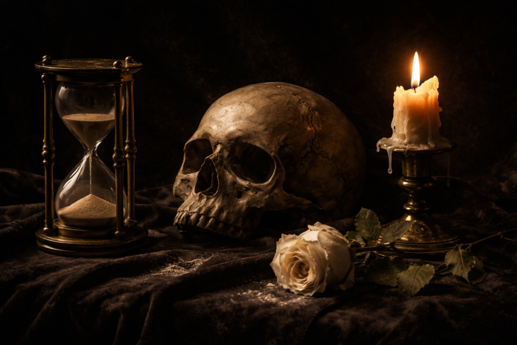 The skull on the desk. The half-burned candle. The cut flower in the vase. Vanitas painting accumulated objects whose only shared property was that they would not last. The hourglass was among the most common. It appeared in Flemish still lifes with the same frequency as fruit left to mottle, another beautiful thing on the verge.